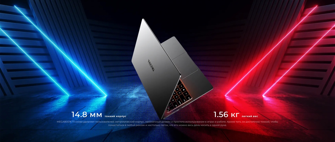 Megabook T1 имеет цельнометаллический корпус с лаконичным дизайном. Несмотря на большой экран 15.6”, ноутбук остается легким и тонким, органично сочетая стиль и функциональность.