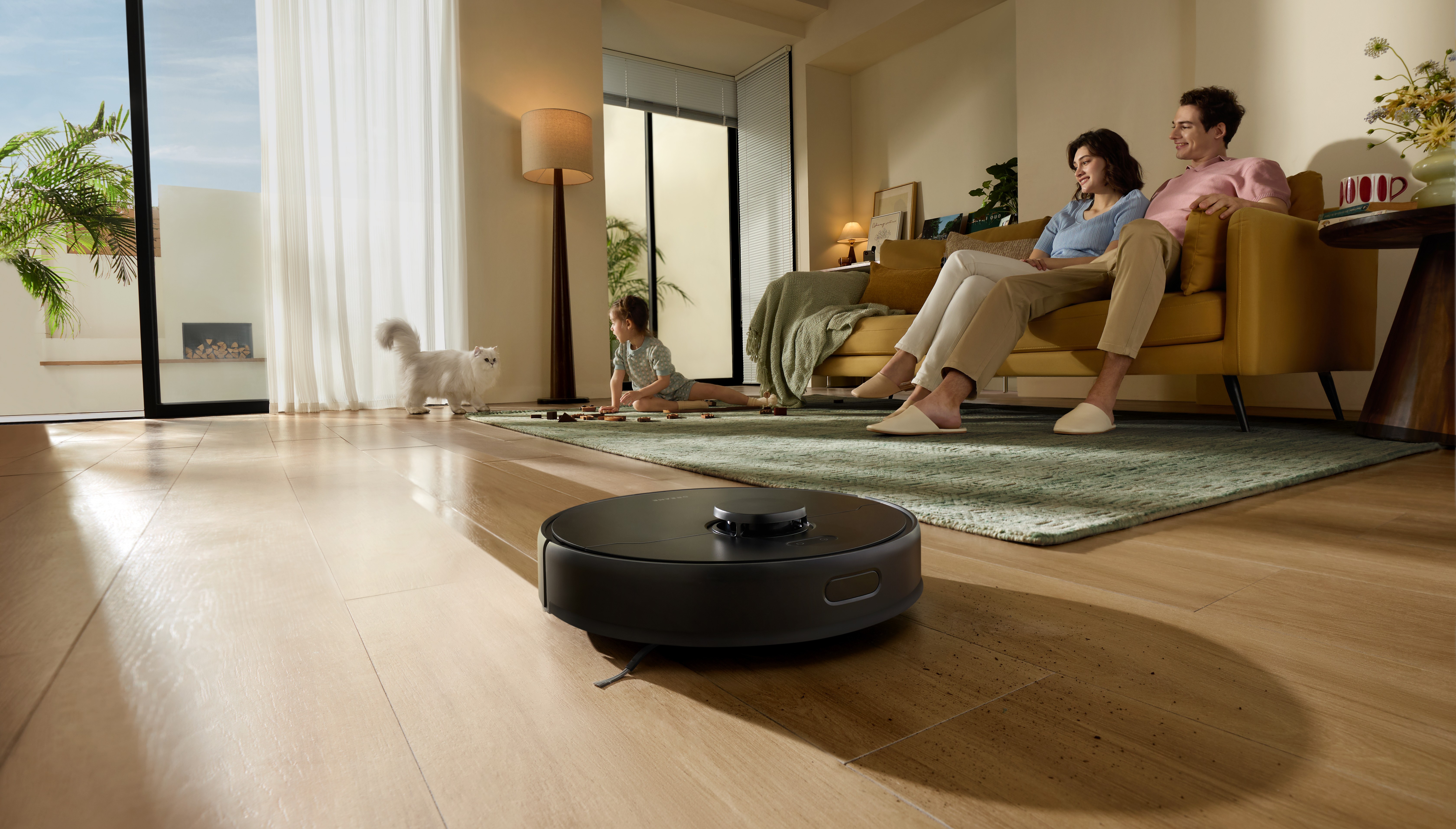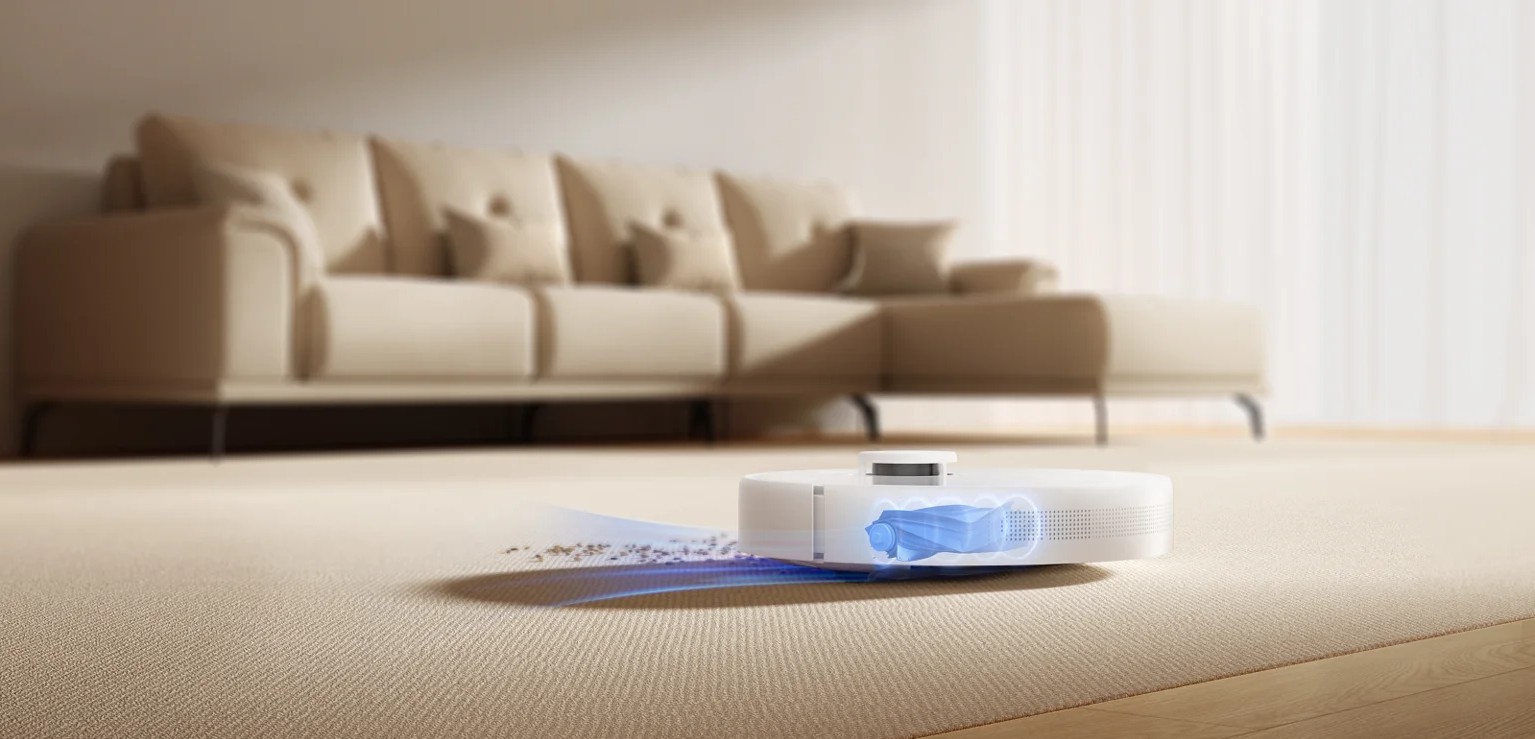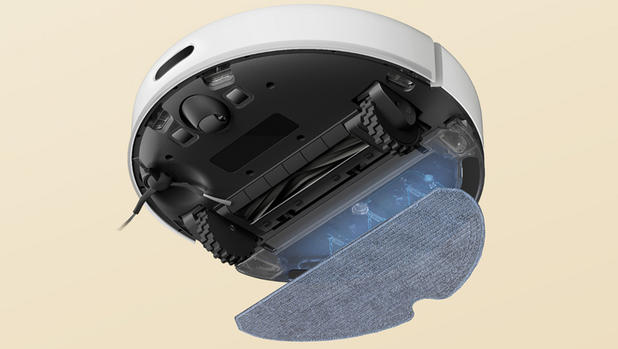 Вместо стандартных щёток здесь используется полностью резиновая — она не только лучше справляется с волосами, но и не наматывает их. Щётка легко поднимается над препятствиями, что снижает вероятность застревания и упрощает переходы между покрытиями. А при попадании на ковёр робот автоматически усиливает всасывание, чтобы удалить пыль даже из глубокого ворса.