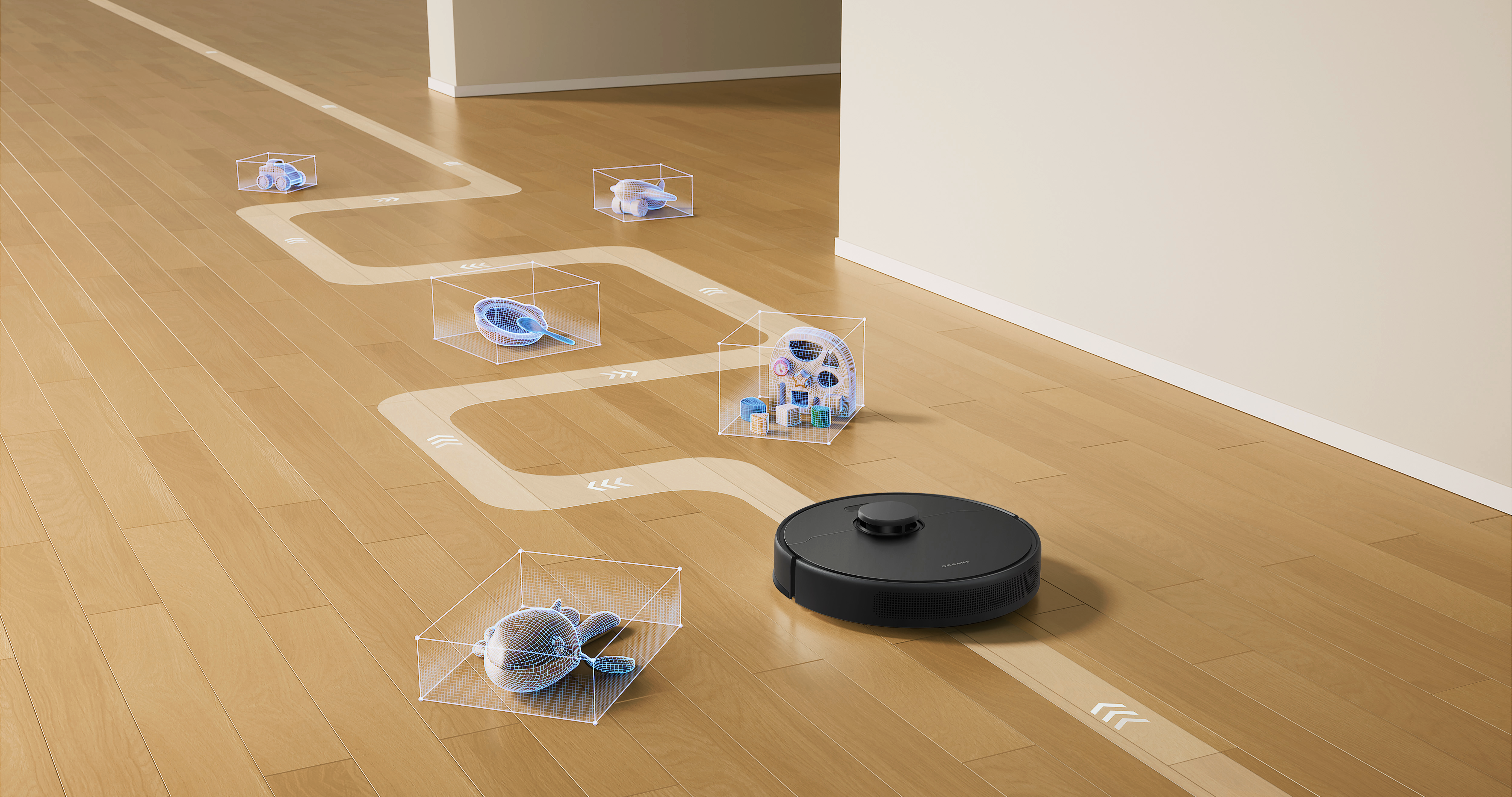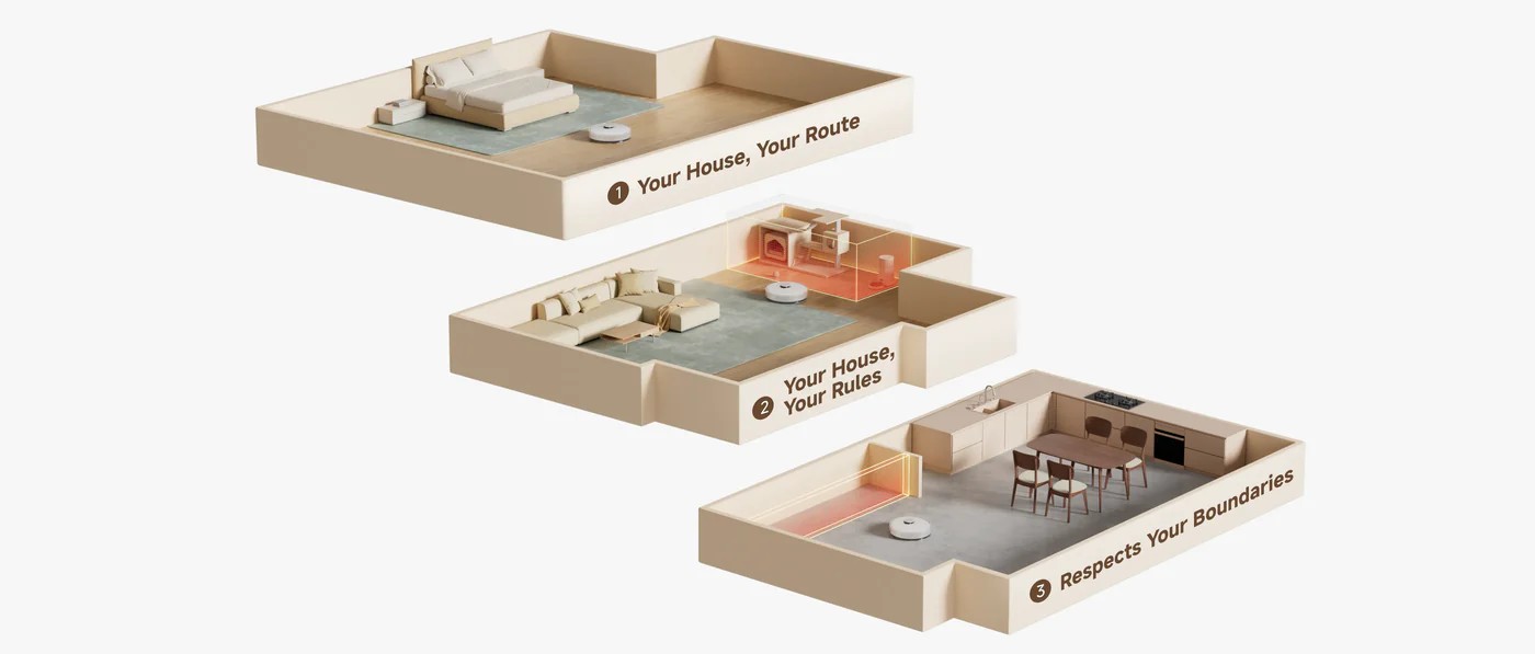 Dreame F10 оснащён интеллектуальной системой Pathfinder, которая с помощью лазерного сканирования точно формирует карту помещения. Благодаря этому робот аккуратно объезжает мебель, определяет запретные зоны и выстраивает маршруты так, чтобы не пропустить ни одного сантиметра. Даже в условиях плохого освещения он ориентируется без проблем, что особенно удобно для уборки ночью или в тёмных углах.